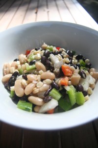 Wash the beans and corn and place in a large bowl. Add diced peppers, diced onion and crushed garlic to the bowl. In a salad dressing container mix the remaining ingredients – shake to mix. Pour over the beans mixture, and stir to cover.