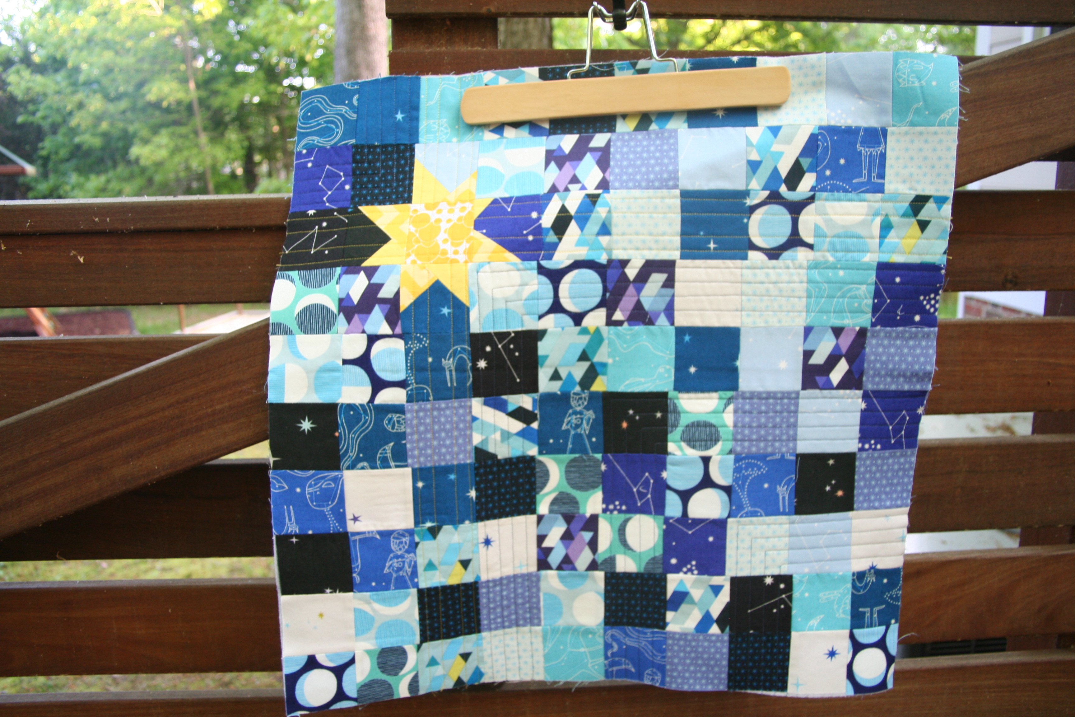 After last week’s cushion top, I received the best compliment, my 5-year-old son asked if I could make him a cushion. I started the strips and posted on Wednesday my start with the “space” themed cushion top using “Constellations” by Lizzie House for Andover.