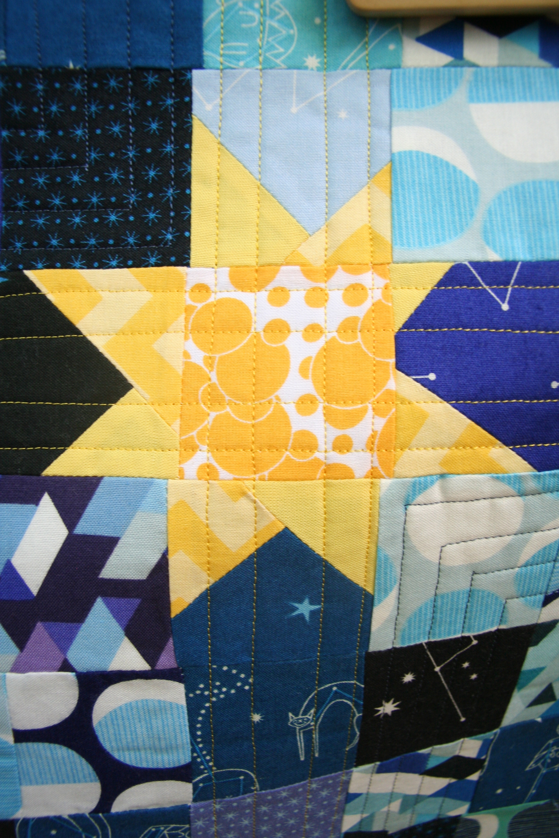The quilting on this one I went with dark blue straight lines radiating from the wonky star, which is our sun, to kind of represent orbits. These lines were alternating to make sure the softness was left in the cushion cover. I also added yellow lines both horizontal and vertical directions through the sun.