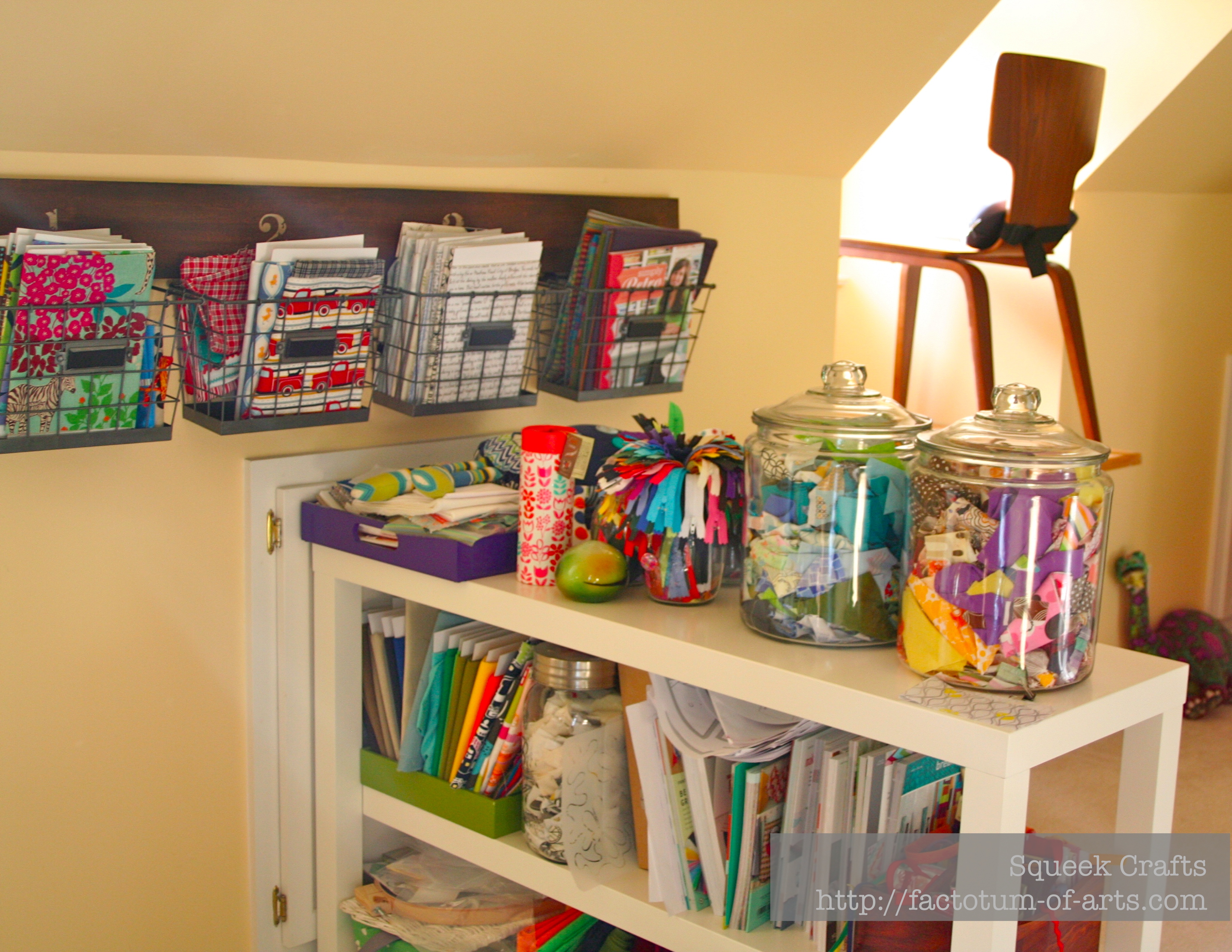 Larger view of my storage with scrap bins, zippers, books, linens.