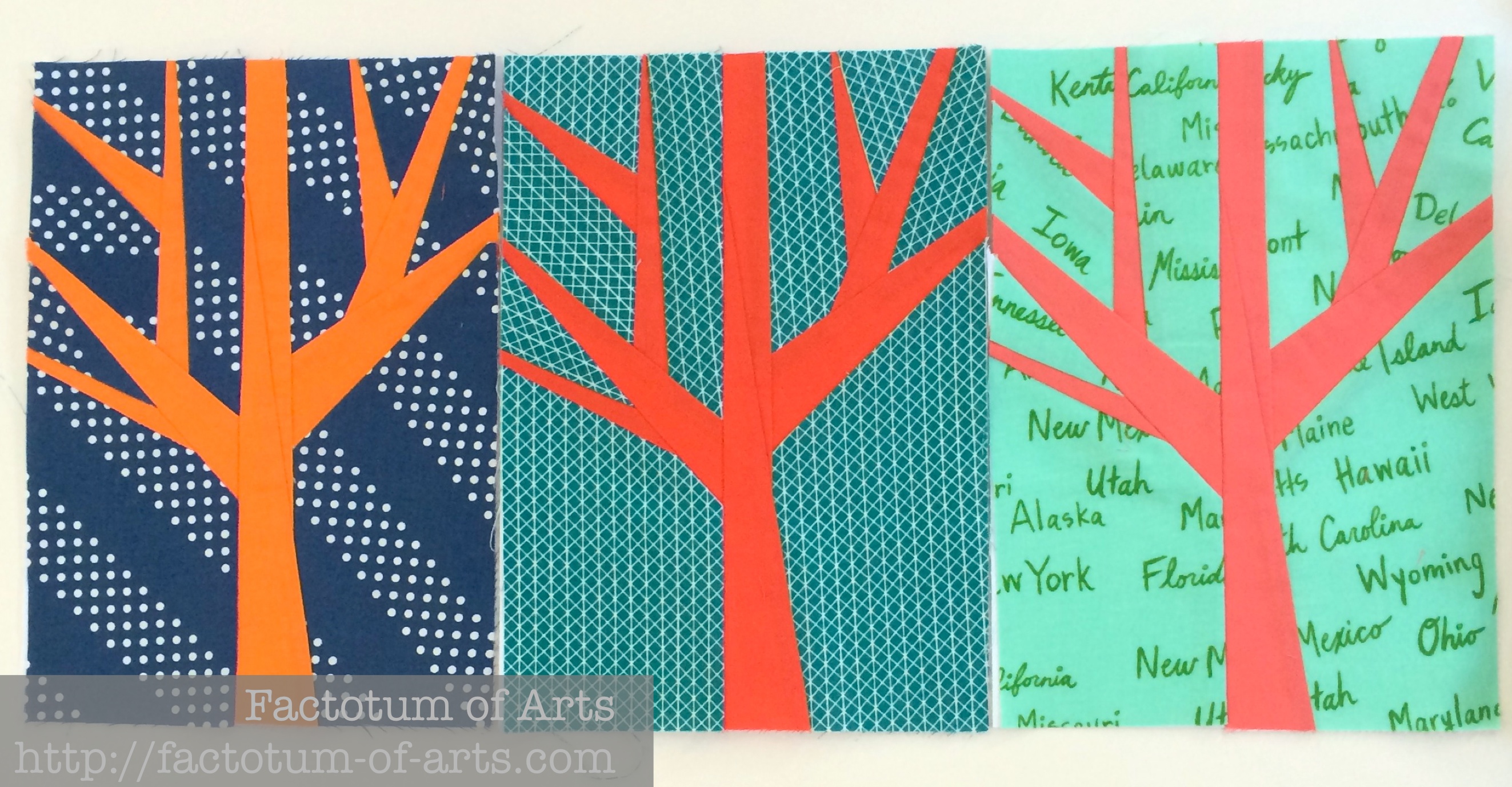 So, yesterday, I made up 3 of the 4 tree blocks in class, using Hawthorne Hues and Cotton and Steel Basics. I love the blues and the corals/oranges. One more block to go in Navy and Red. I am thinking of using Mustard, Bone and a Grey for borders.