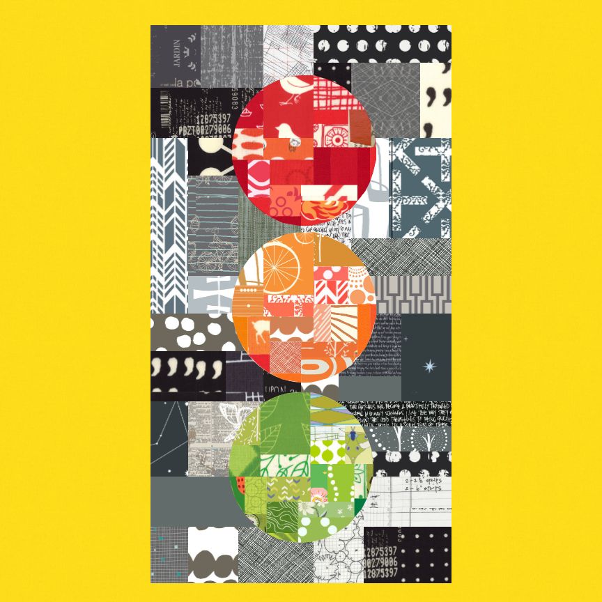 We see traffic lights everyday. I have always has this image of traffic lights making an interesting design as a quilt. That image was using improvisational piecing. Lucky for me, this palette came with the red, orange and green allowing me to stretch to this design of my traffic lights. I love the bright yellow solid background as it allows the other colors to pop against the improv black/grey piecing.
