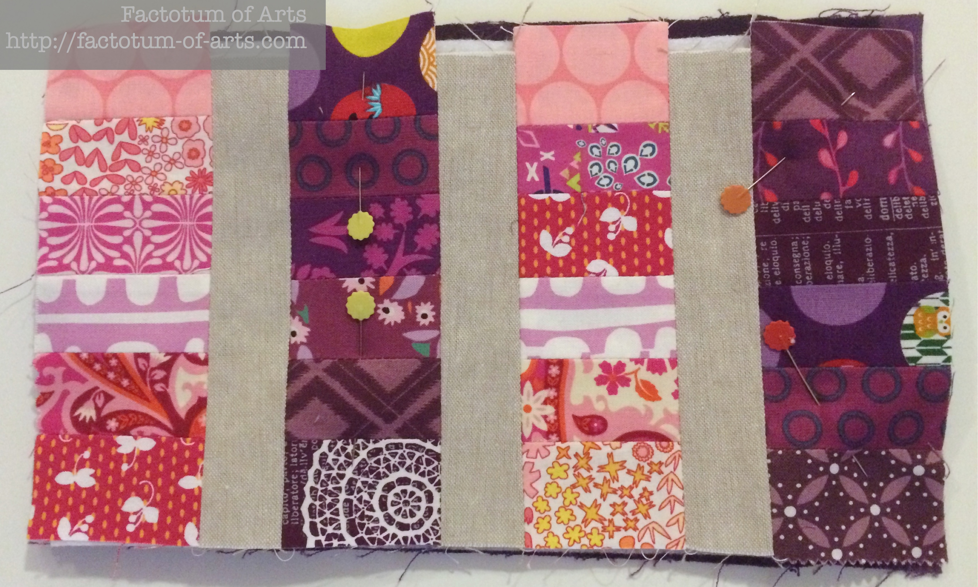 - Sew the 2.5″ x 1.5″ pieces into 6.5″ x 2.5″ strips and trim. Layout the your sleeve. Sew the scrappy strips together with the 6.5″ x 1.5″ linen strips. This will make a block of ~10″ x 6.5″.
