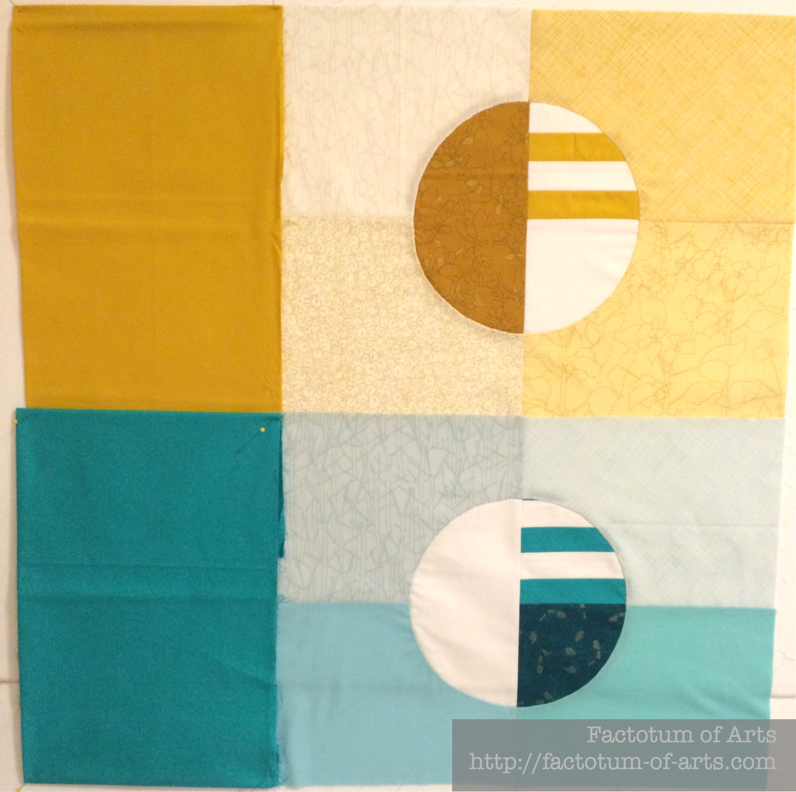The last design decision was the fabric for the matching binding. I wanted it to be color blocked from the start. All solid? All prints? In the end I chose a mix; I decided that the jade and the green blocks would be the solid color, since the print was dramatically different from the solid. The other 4 blocks were bound in the matching print used in the border and circles.