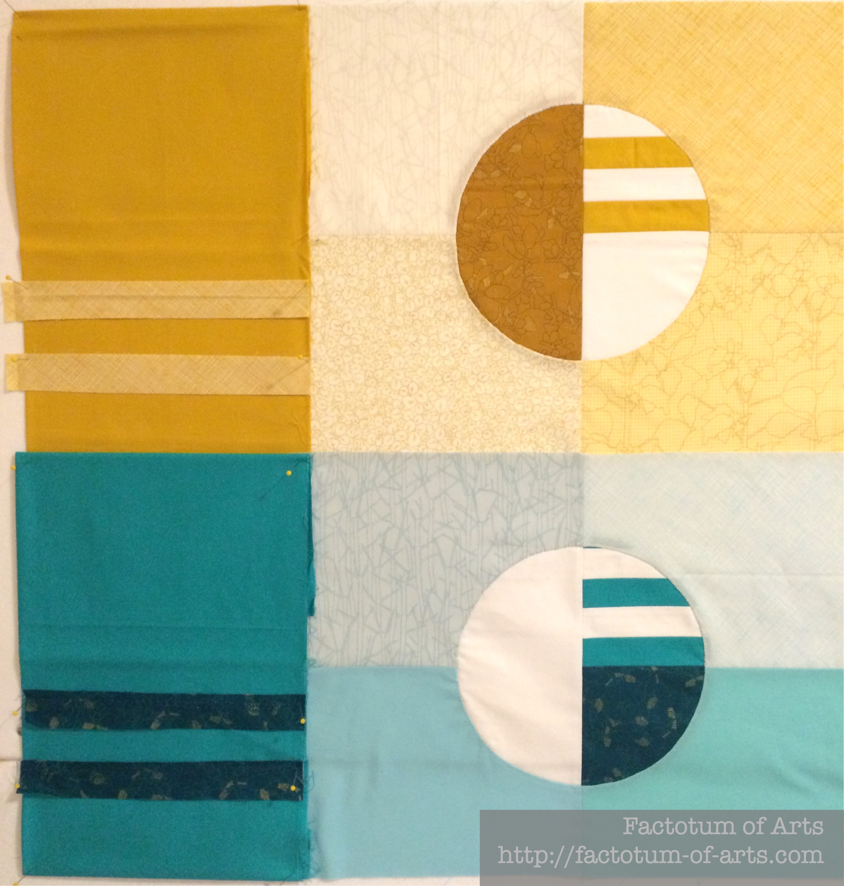 After playing with the circles on my design board, I decided I liked a warm color placed with a cold color on each row. The other thing I had decided at this point was to switch out the light green print with the darker green topology print.