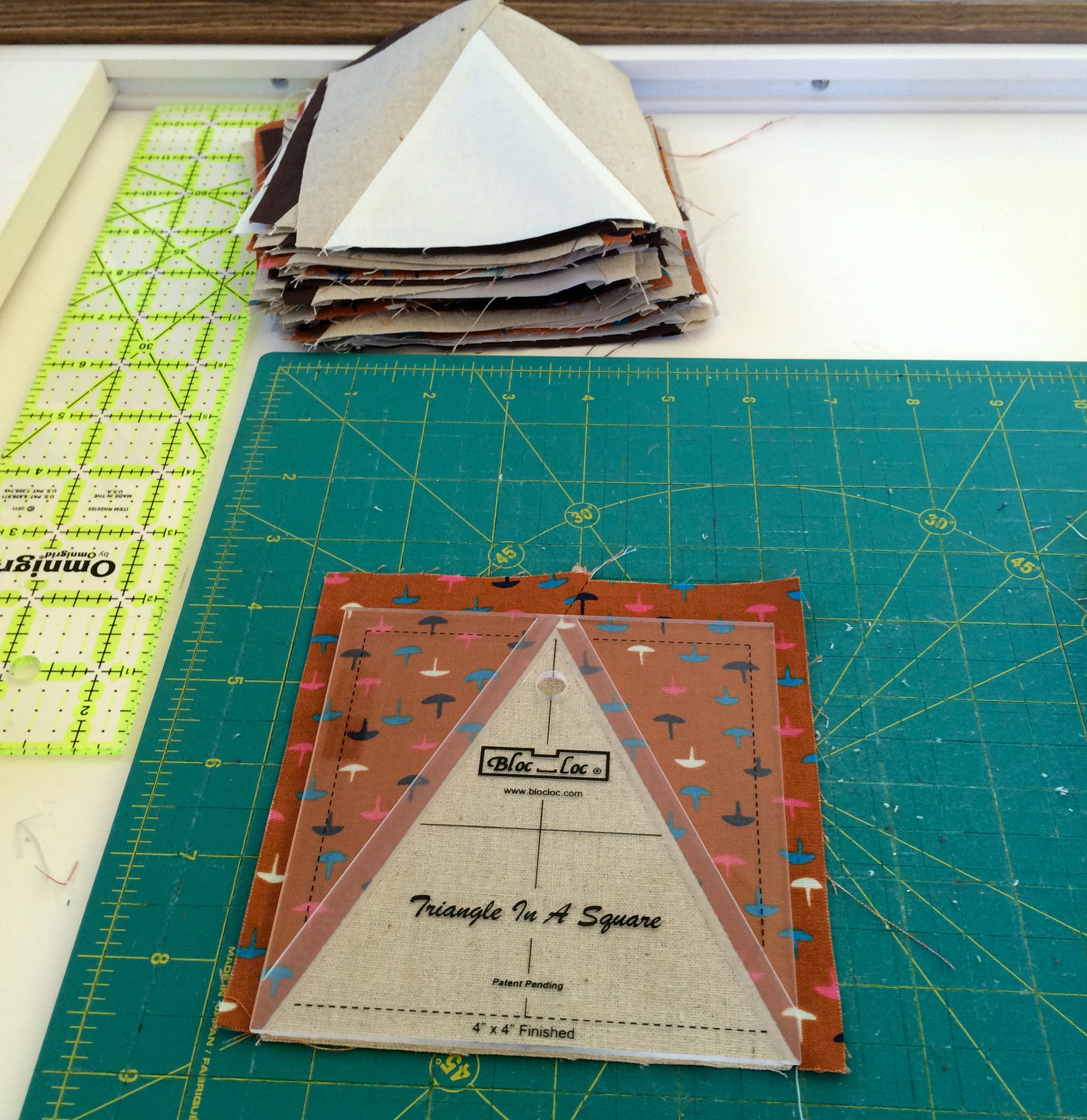 The final trimming of all those triangle blocks…I love the Bloc-Loc Ruler, which was one of my new toys, I purchased from Pile of Fabric over Thanks giving.IMG_3221