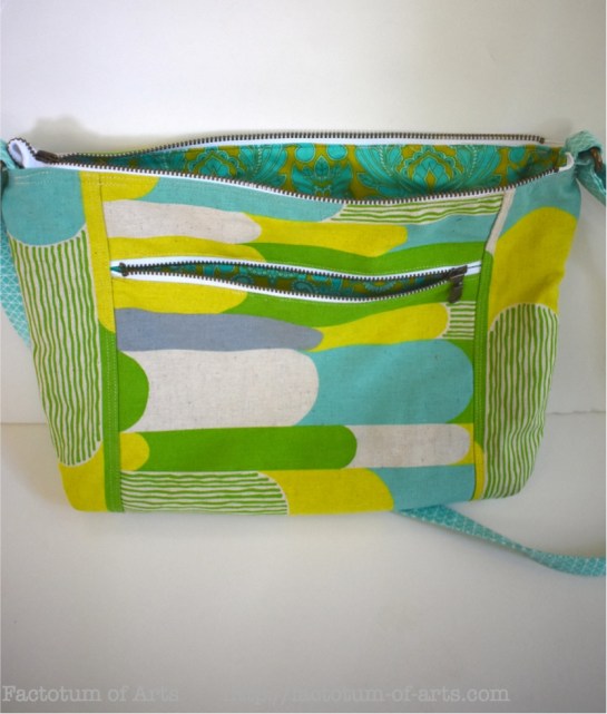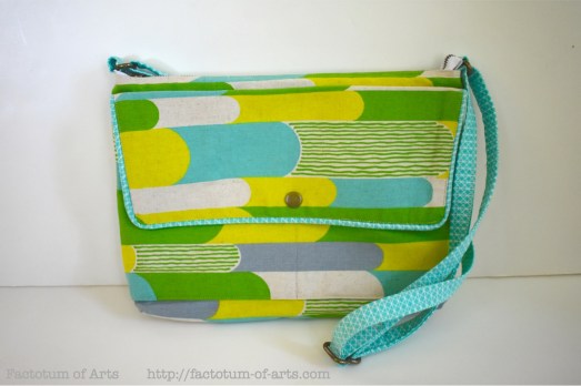 I love this little bag, only my third I had ever made!! This was the first time using actual bag hardware to make that strap. Strap and piping is a mint Cotton + Steel basic.