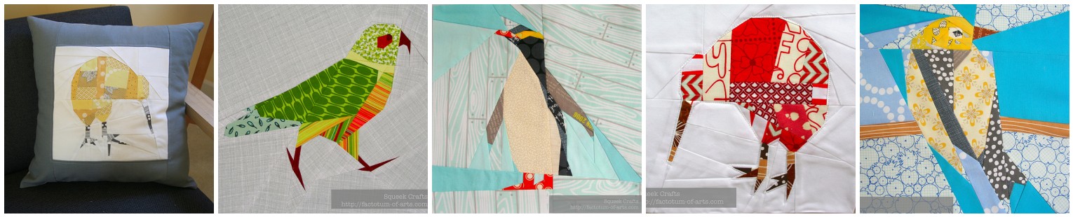 1. Finished Kiwi Cushion – Front, 2. Kea paper pieced block, 3. YellowEyedPenguin_FullBlock, 4. Kiwi – Paper Piecing, 5. Wax Eye Paper Pieced Block