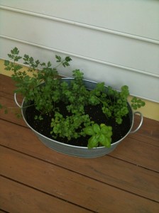 In two oval tin barrels, I grew the herbs again from seed…basil, thyme, rosemary, chives, oregano, and parsley.
