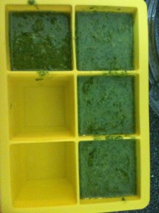 I made two batches and it looks like I will still have a third batch before my basil is done :-). I froze my pesto into 2 inch ice cubes (this large ice cube container I found at Crate and Barrel but it is now available at West Elm as well). I plan on defrosting them into small glass containers for Christmas gifts.