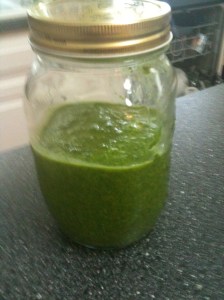 The basil in our garden went chaotic this year and I needed to find a good use for it. Everyone suggested Pesto. I found a great recipe on allrecipes.com. I am not a huge fan of pesto – it is a little too strong, but the spinach and other herbs in this recipe complement the taste and makes the pesto a little more subtle. All the herbs came from our garden.