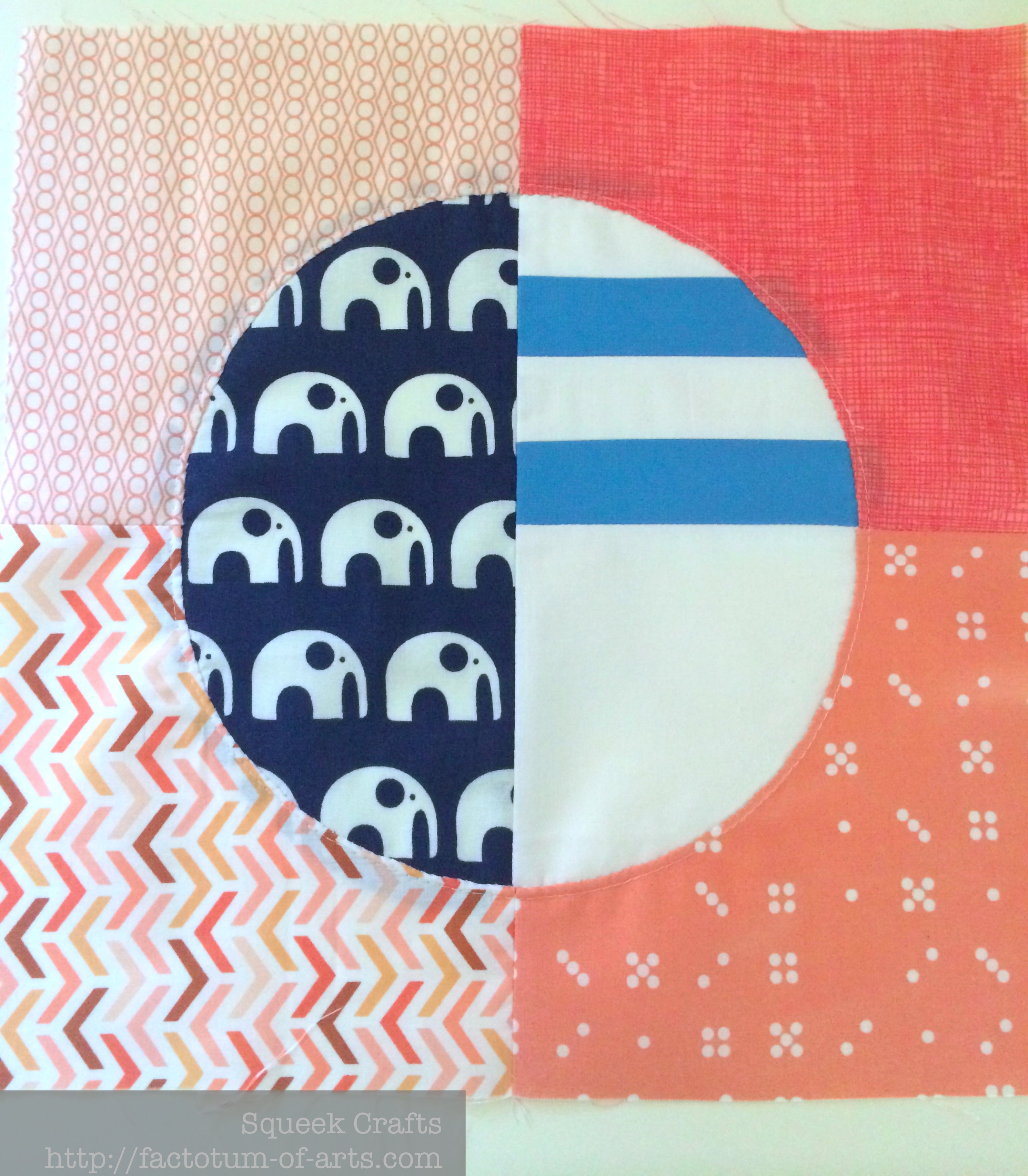 - Overlay the background square on the inner circle. Match up the intersecting lines (there are 3 of them in this block). Pin them in place, add more pins if desired to hold fabric in place.