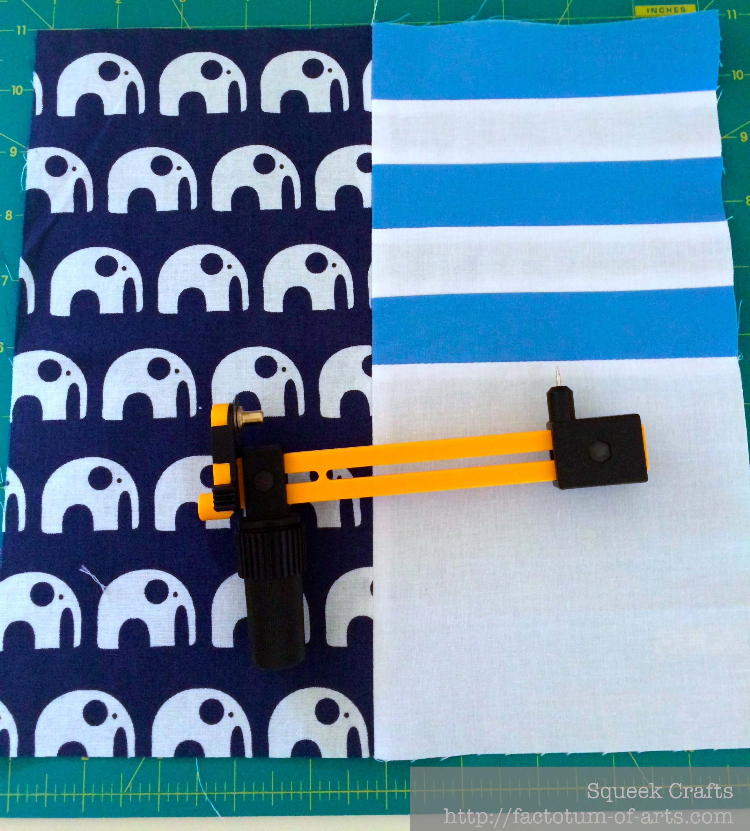 Sew your white and colored strips together for approximately 12″. Cut excess and press seam open. From this strip, cut 2 5.5″ pieces and cut an additional 5.5″ single piece from the colored skinny strip. Sew these 3 pieces together to form a striped 5.5″ square – as in top right square below. Layout your pieces, the 5.5″ striped square, 5.5″ white square and 5.5″ x 10.5″ printed fabric.
