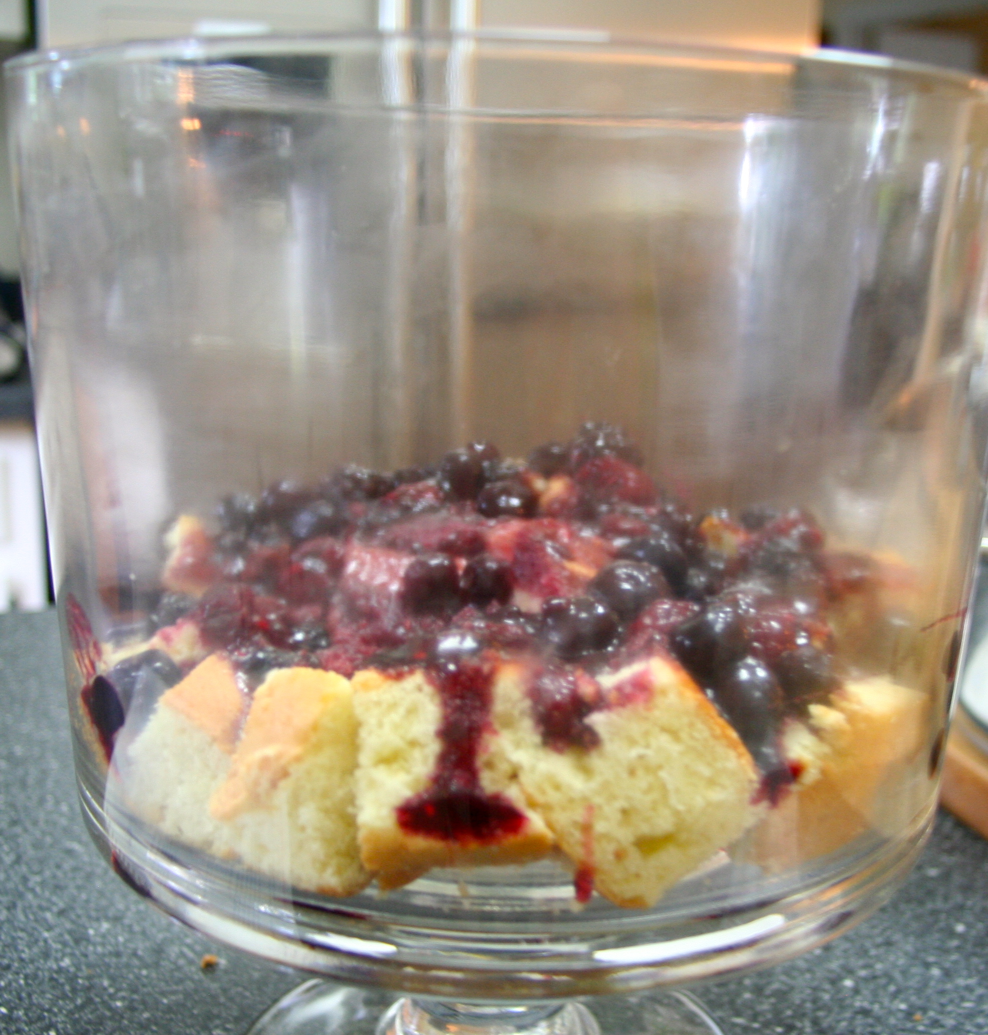 Using a ladle, spoon 1/2 the berry compote evenly over the sponge.