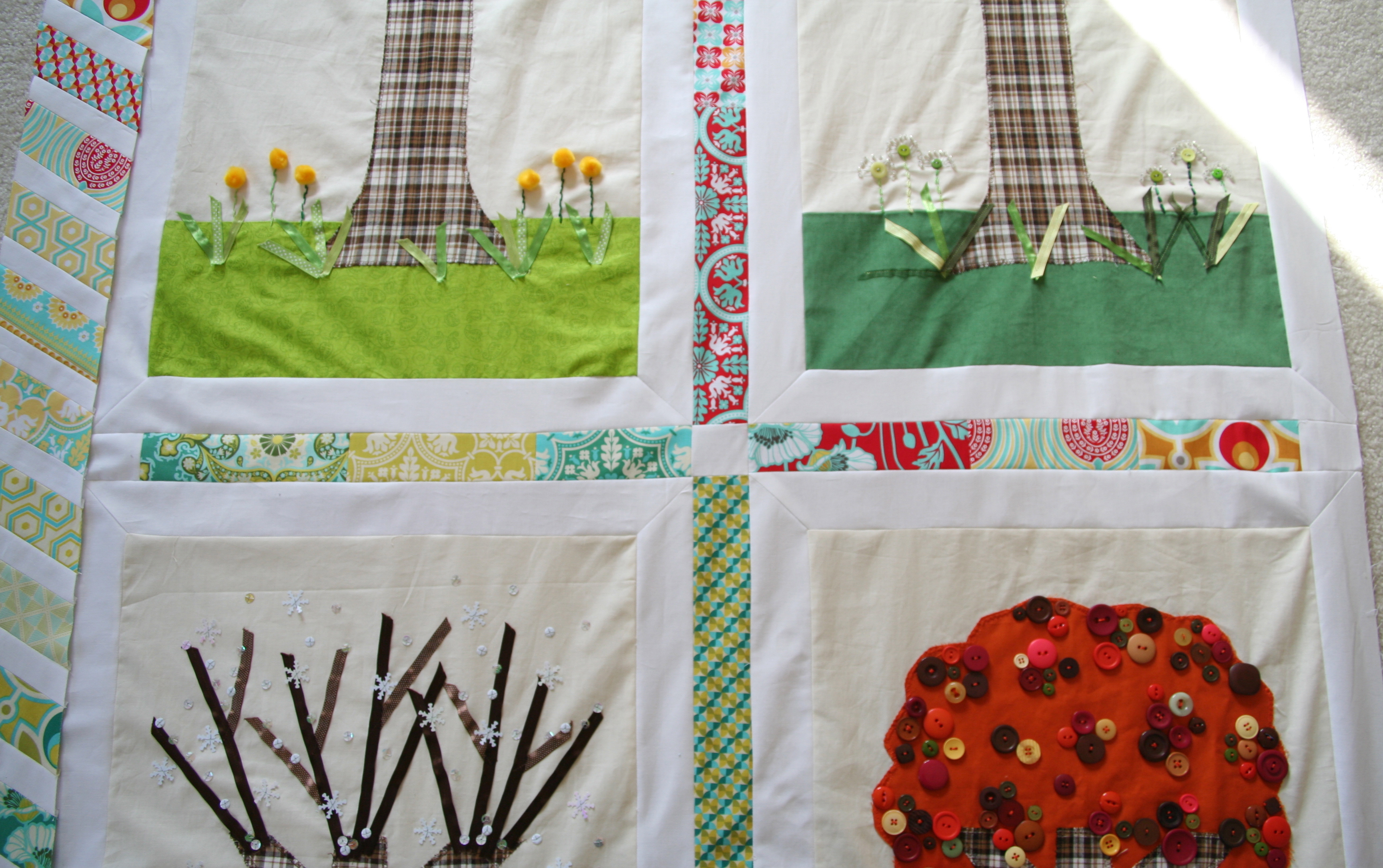 I have finished 1/2 of the top of my 4 seasons quilt. I am really liking the choice of the Notting Hill, Joel Dewberry fabric choice for the borders. Below, are the pictures of the season panels of the quilt, that will help explain my options.