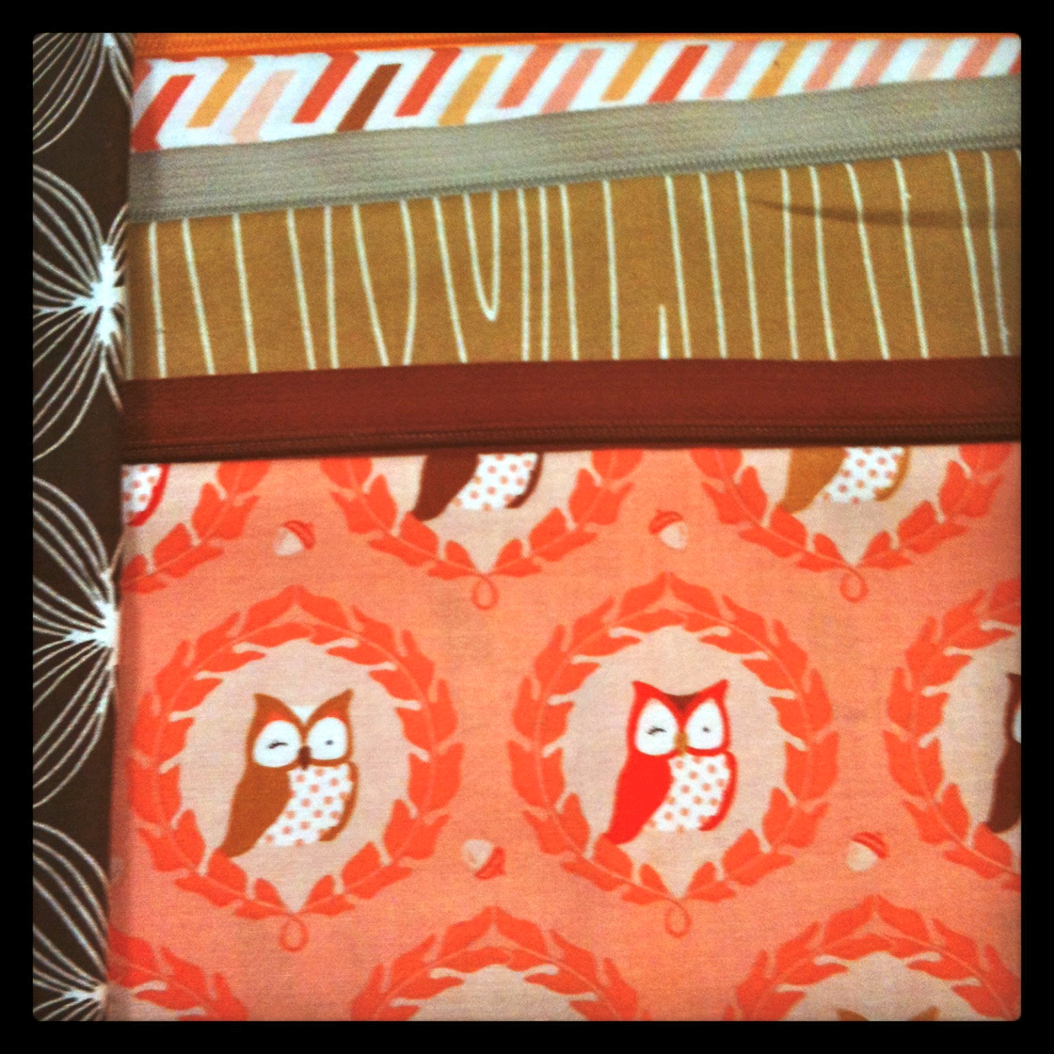 I wanted to complete a triple zipper pouch, well I have finally decided on my fabrics (Les Amis Fabrics by Patti Sloniger for Michael Miller) and zippers (Red-brown, Taupe, and Orange-Pink).