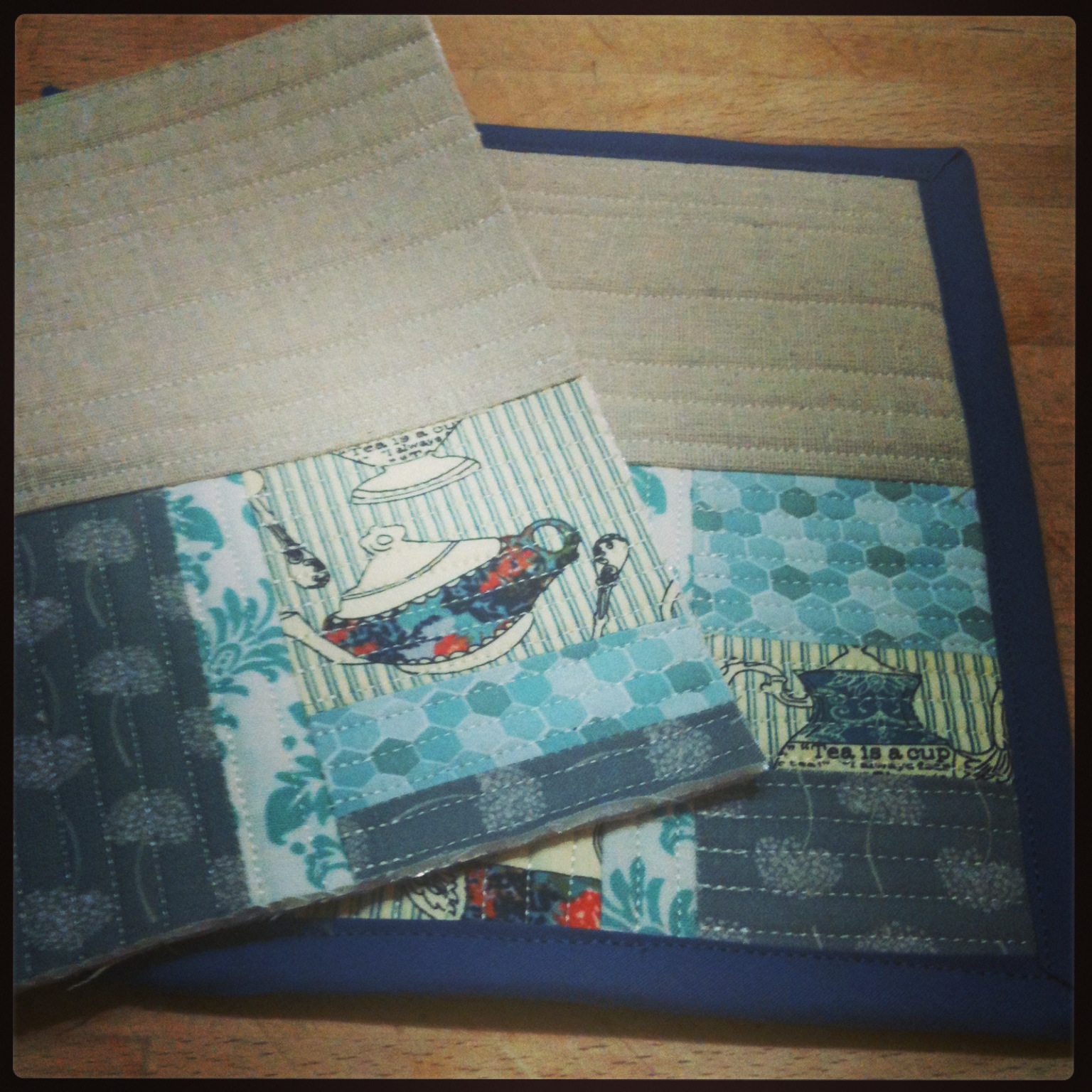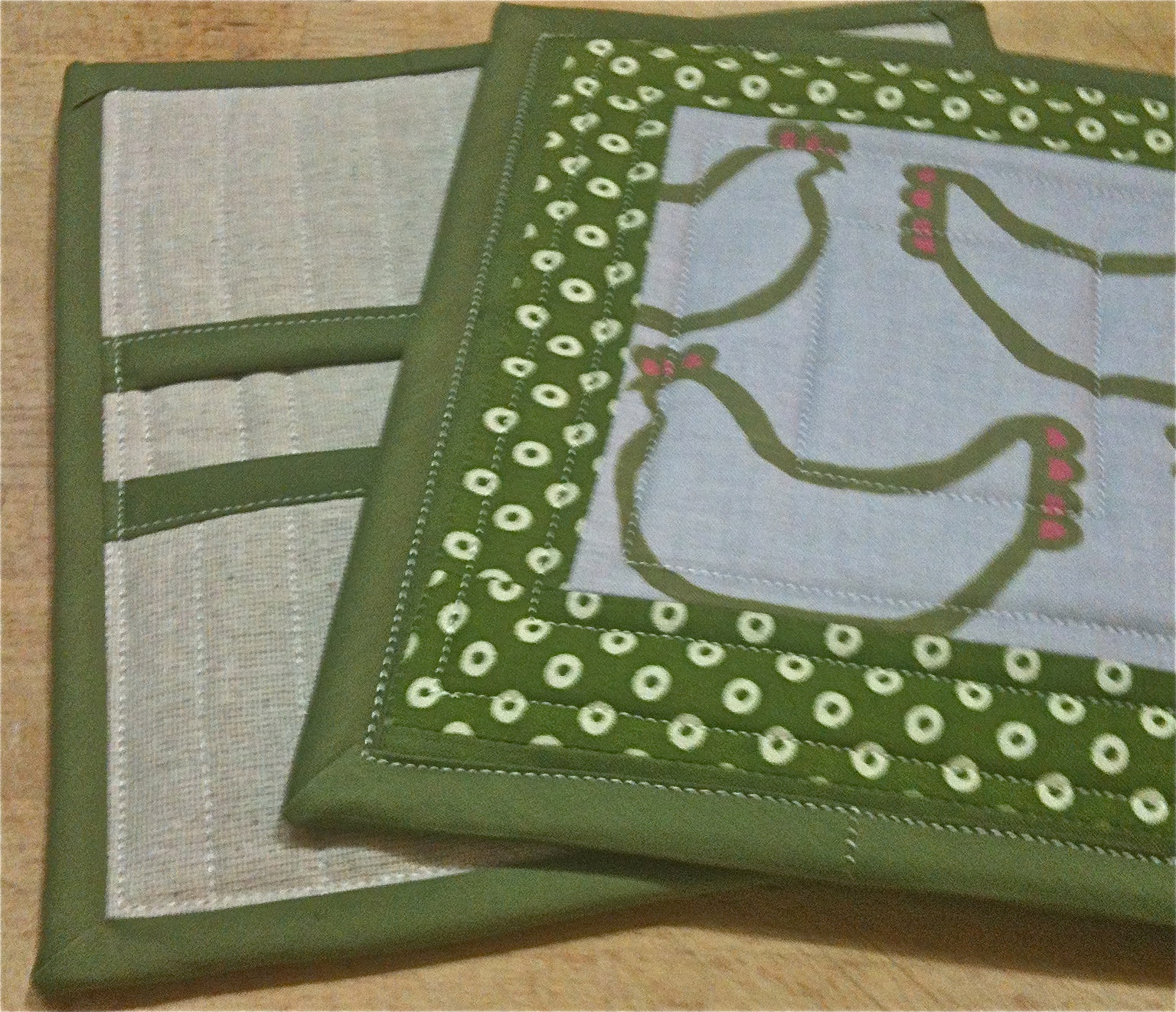 I am still working on finishing the set of two pot holders. The chicken ones are completed (and being sent to ClumsyKristel this week) and the blue teapot ones are closer to being finished.