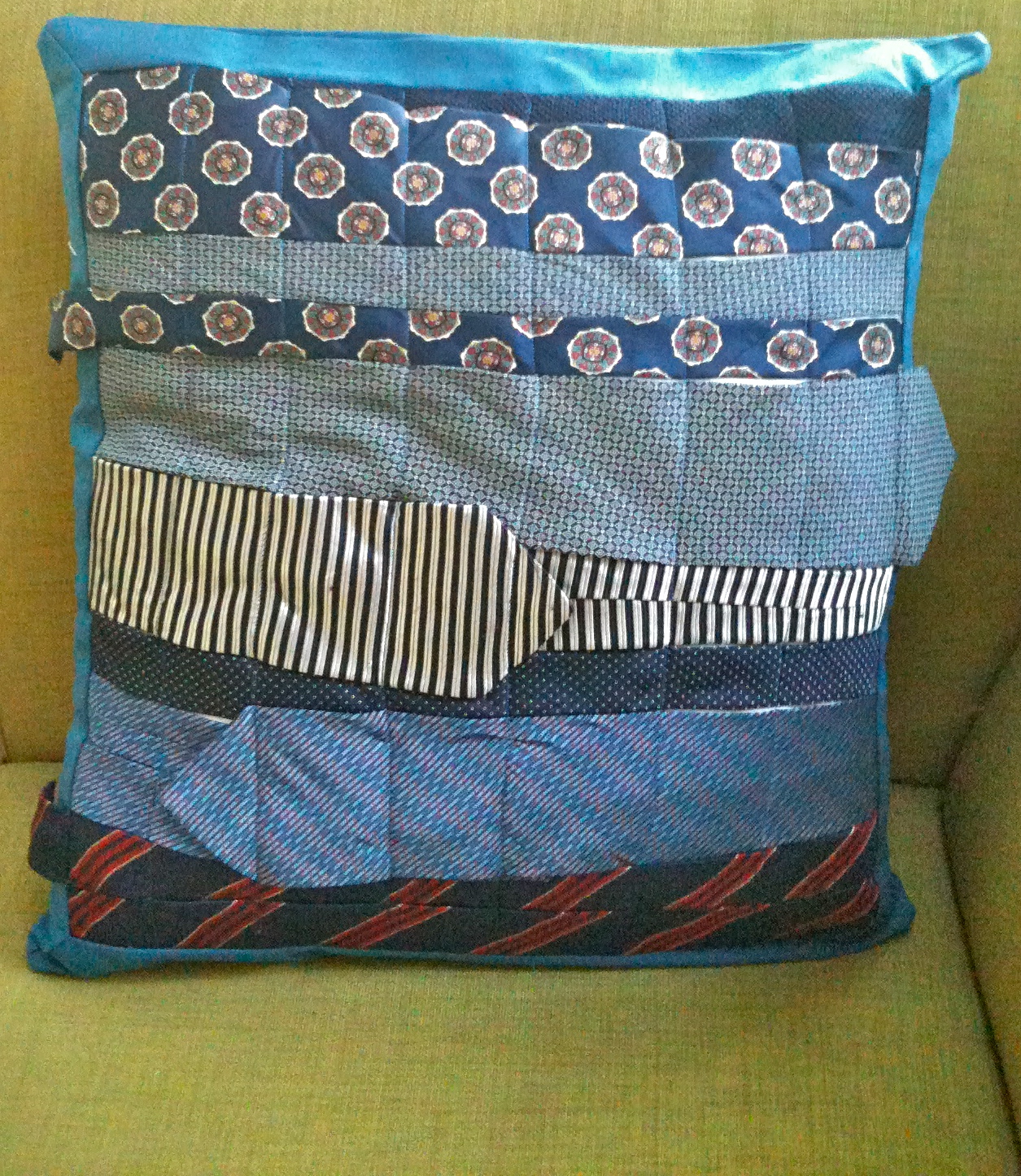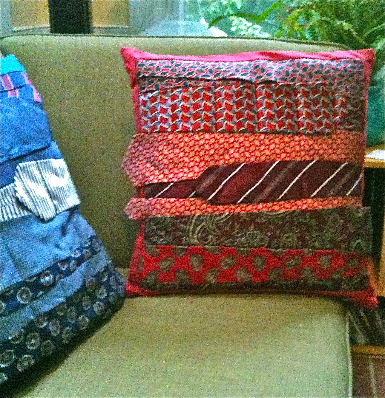 …led me to this idea…what if you could recycle men’s ties and make sofa cushions. I first had to find men’s ties (not an item my surfie-type husband has in the closet 🙂 ) – so I took myself to the Good Will shops around our area. To my surprise ties only cost $1.39 and many of the shops had a good range especially in blue and red.