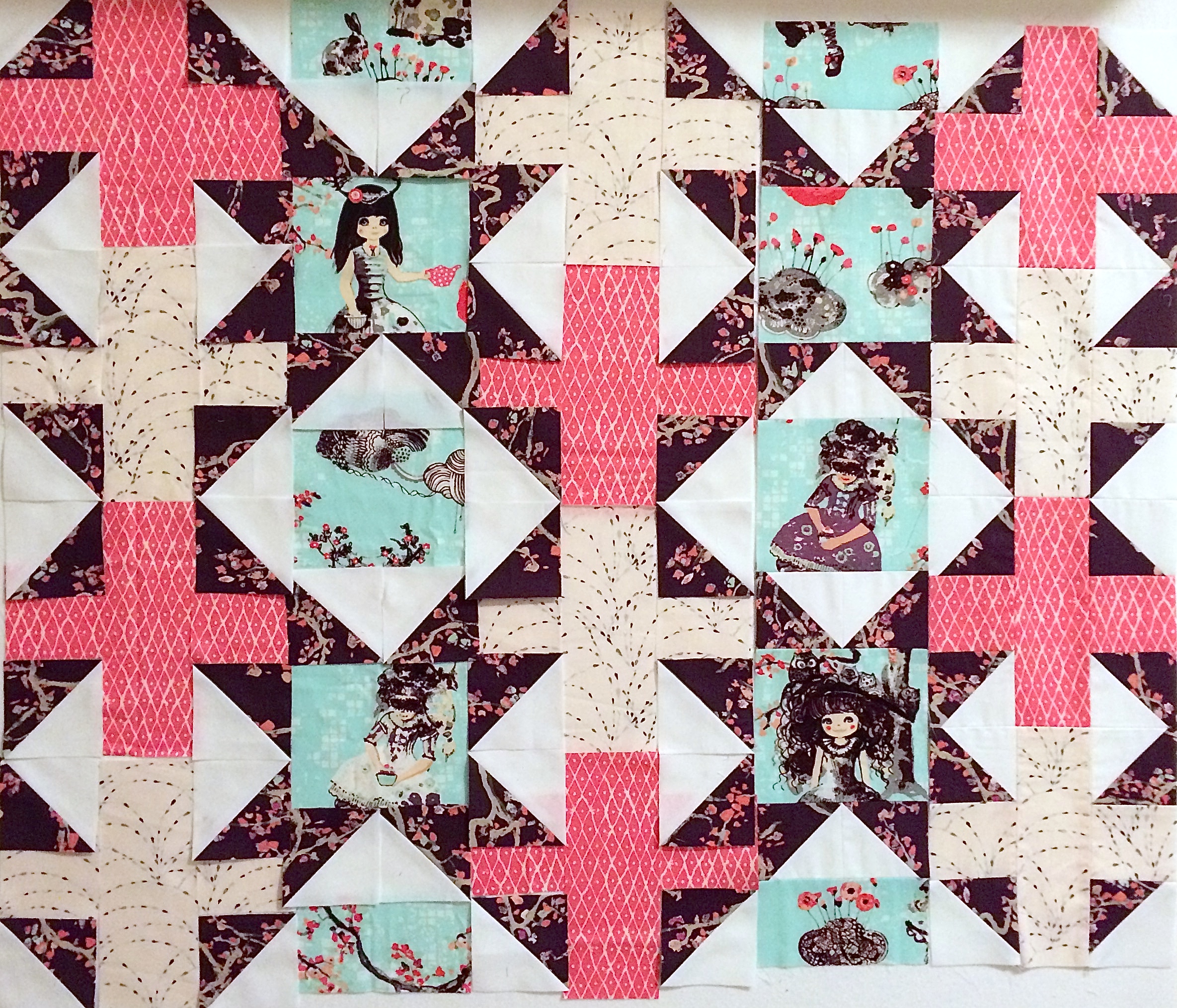 Here is how the mini quilt finished up. The crosses are bright pink and a very pale pink. That pale pink fabric actually has a shimmery silver through it that is so delicious. I finished the quilt with the pale blue Enchanted Leaves Air fabric, highlighting the blue in the focus blocks.